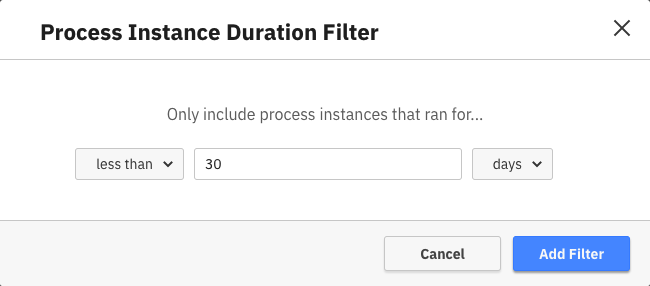 The Process Instance Duration Filter allows you to only regard process instances whose execution from start to end took a certain amount of time. For instance, you can filter process instances that took more than three days or less than five seconds. Note: This filter shows only completed process instances, since the total duration of running process instances is not yet known.