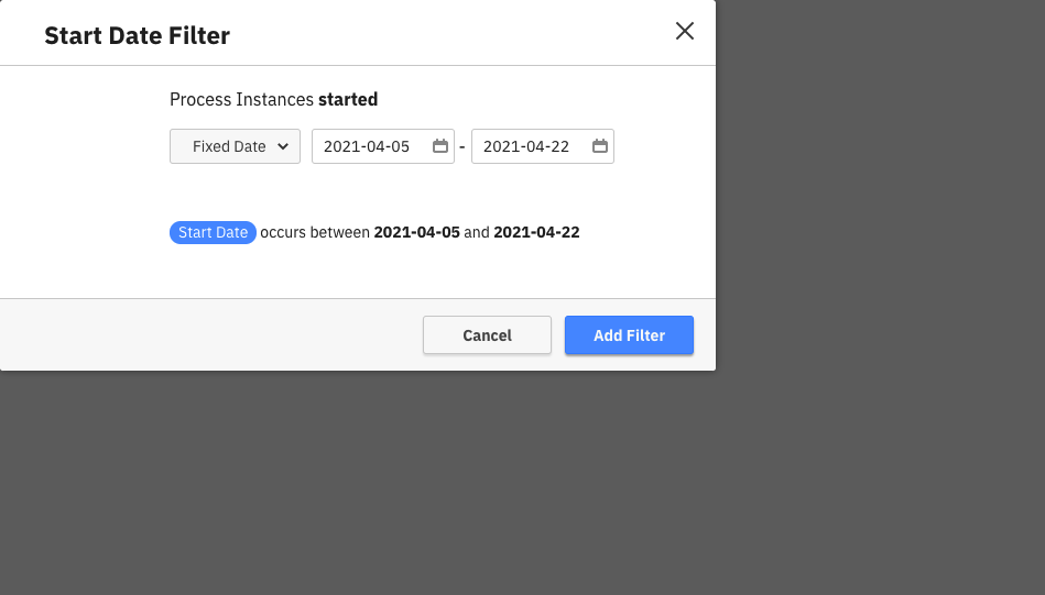If you do not want the filter to be dynamic, you can also select Fixed Date which only considers process instances that were started or ended within a fixed date range, e.g. filter all process instances between 2018-01-01 and 2018-01-26. This range is fixed and does not change.
