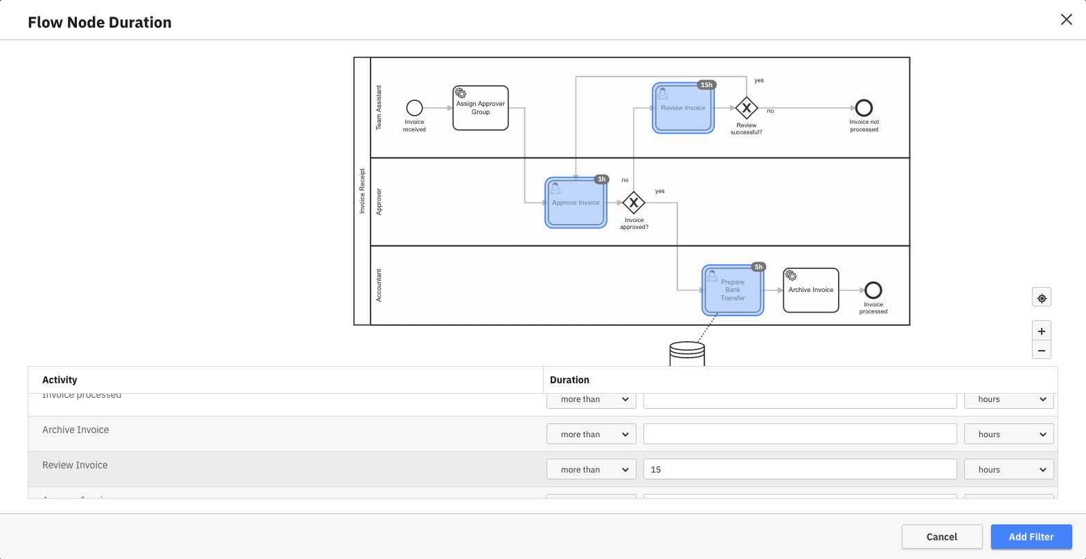If the Flow Node Duration Filter is applied as an instance filter, it will only regard process instances where one or more Flow Nodes took a certain amount of time for their execution. For instance, you can filter process instances where a Flow Node took more than three days or less than five seconds.