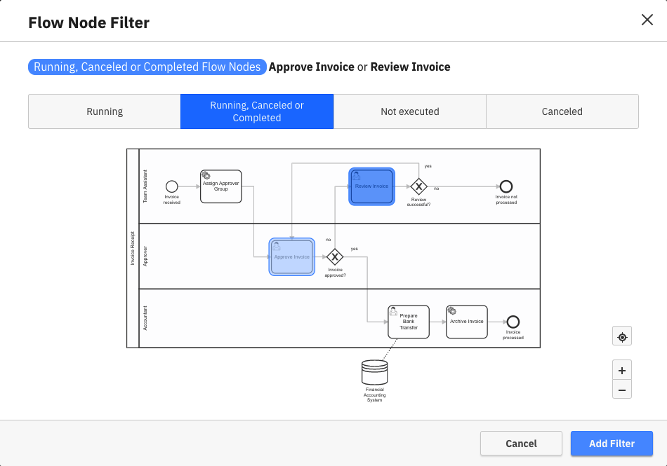 Retrieve only those process instances that executed certain Flow Nodes within your process by using the Flow Node Filter. Selecting several values at once means that all the selected Flow Nodes need to have been executed at least once in the process instance lifetime. At the top of the Flow Node filter modal you can see a preview of the filter you are about to create. You can also filter process instances where certain Flow Nodes were not executed.