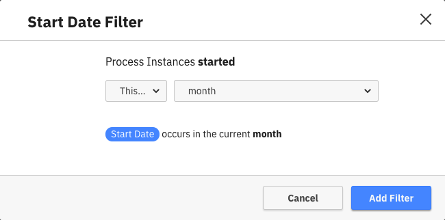 This filter also moves with time and is automatically adjusted to cover completed periods of time. To clarify, let’s take the following example: Today is Wednesday March 11th. If you set a date filter to ‘Last… + week’, you get all process instances that were started/ended from Monday March 2nd to Sunday March 8th. Now a Week passes and we have Wednesday March 18th. Applying the same filter now filters the process instances which were started/ended from Monday March 9th to Sunday March 15th.