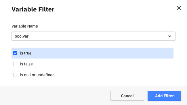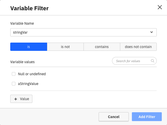 String variables: Two types of operators are available for variables of type String. You can either filter by an exact variable value (is and is not) or filter by a substring (contains and does not contain).
