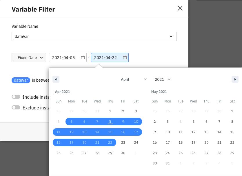 Date variables: This filters all instances where the selected date variable has a value within a specified date range. All the options that are available to configure Date filters are also available for date variables.