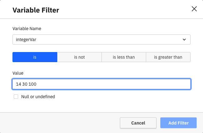 There is an option to include the null or undefined values of the selected variable in the result. By using the same option, it is also possible to show all the values except the null or undefined by selecting the is not option of the toggle button.
